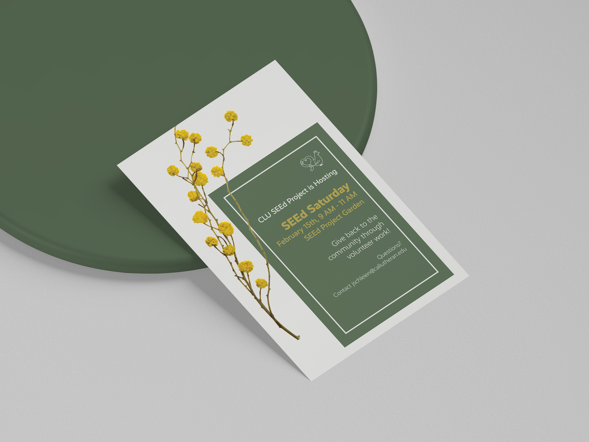 As the graphic designer for California Lutheran University’s SEEd (Sustainable Edible Educational) Project Garden, I was tasked with rebranding the garden with a new logo and style guide, as well as creating graphics for print advertisements and social media assets. Shown here is a poster promoting a SEEd Saturday event for the month of February, inviting members of the campus community to volunteer at the SEEd Garden. Below in the photo grid is the new logo I created for the garden, which features a chicken from the garden’s chicken coop and a worm from the vermicomposting shed. I’ve also included different applications the new logo, such as stickers, a staff t-shirt, and a hand-painted sign.